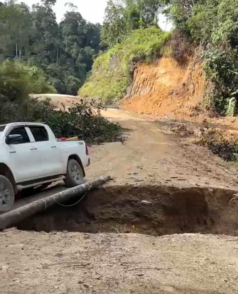 Jalan poros Batu Rajang di Kampung Gunung Sari, Kecamatan Segah, yang baru saja diperbaiki, kini kembali putus total.