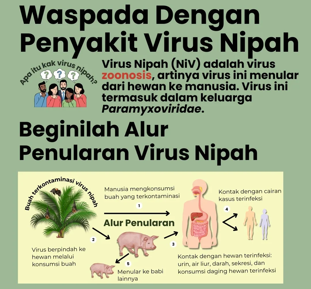 “Hindari kontak dengan hewan ternak seperti babi dan kuda yang kemungkinan terinfeksi virus Nipah,” tegas Tuti.