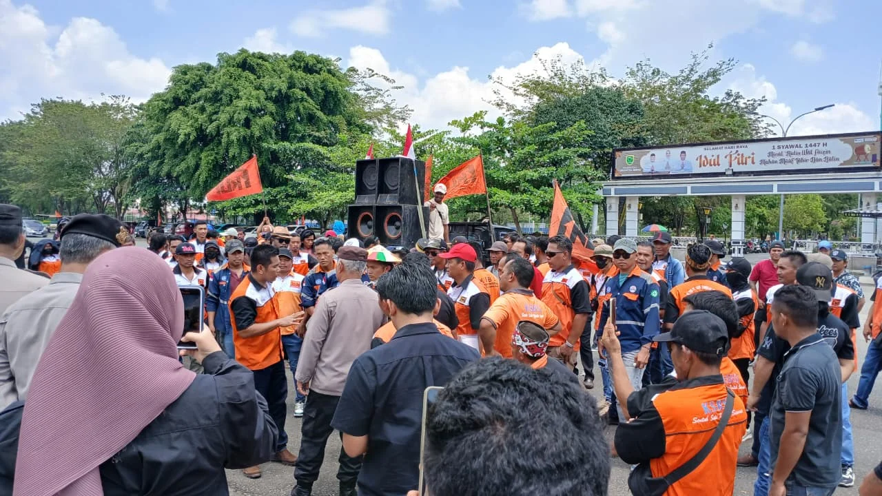 BERAU TERKINI — Aksi unjuk rasa mewarnai halaman Kantor Bupati Berau yang dipicu dugaan Pemutusan Hubungan Kerja (PHK) sepihak yang dilakukan oleh PT Asri Kemasindo.
