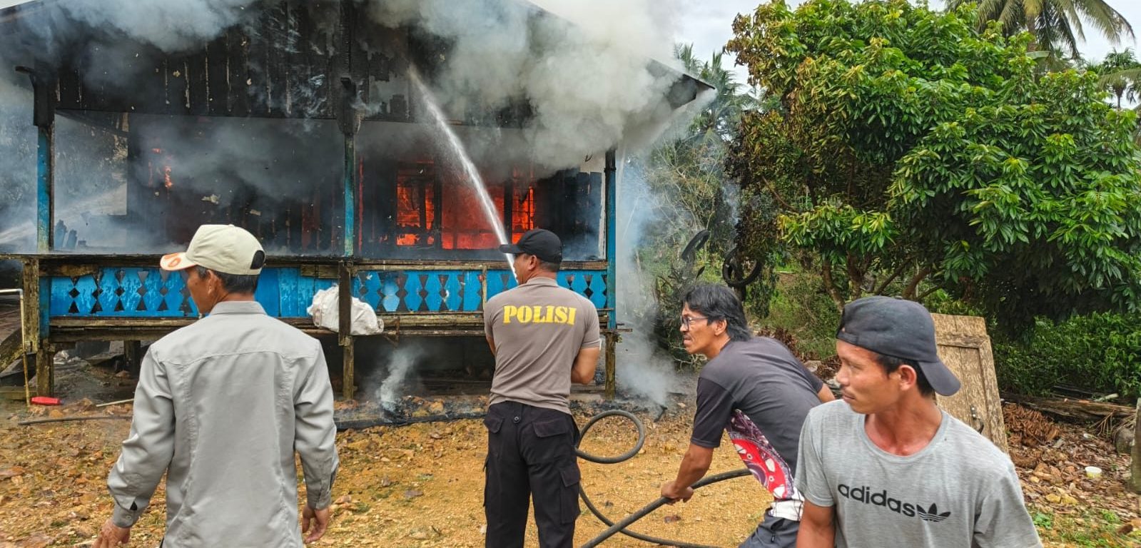 Warga yang berdatangan kemudian memberikan bantuan pemadaman dengan peralatan seadanya.