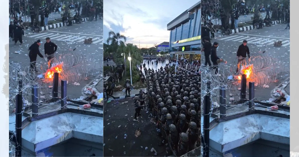 Lalu pada pukul 18.31 Wita massa dibubarkan paksa oleh aparat kepolisian dengan kendaraan watercanon dan personel pengamanan dari kepolisian.