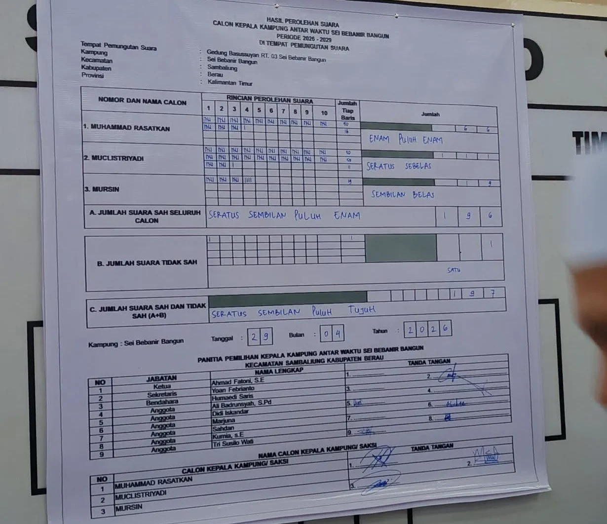 Pilkakam di Kampung Sei Bebanir Bangun, Kecamatan Sambaliung, diikuti tiga calon di mana Muchlistriyadi terpilih sebagai kepala kampung dengan perolehan 111 suara.