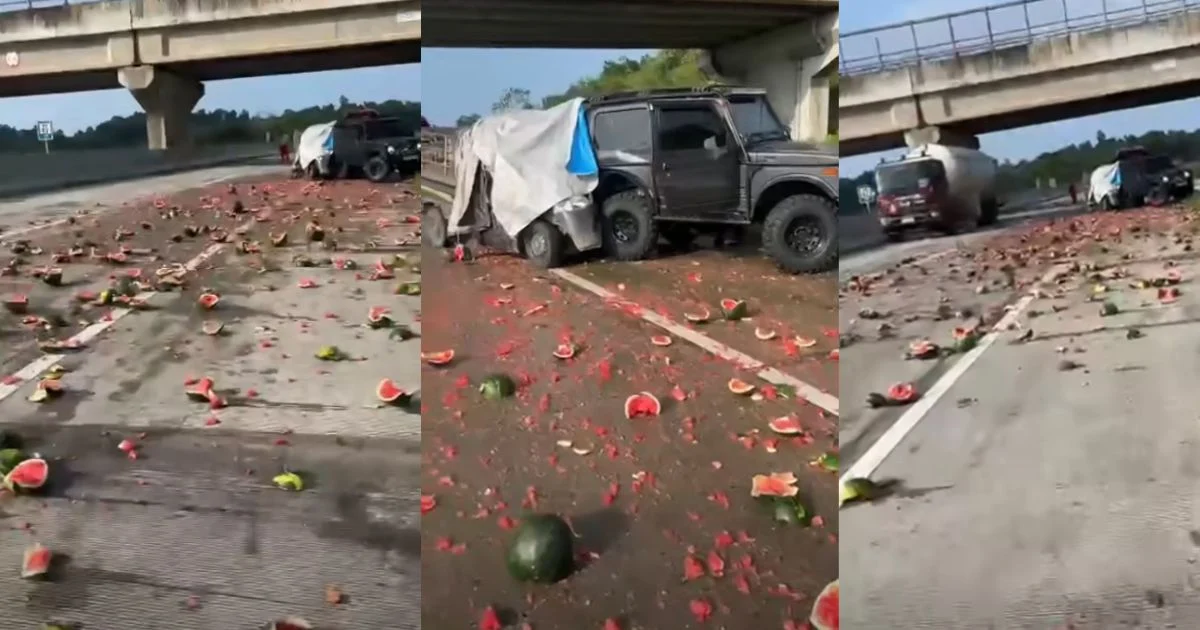 Tabrakan hebat itu membuat muatan semangka di pikap tersebut terhambur ke sisi badan jalan tol.