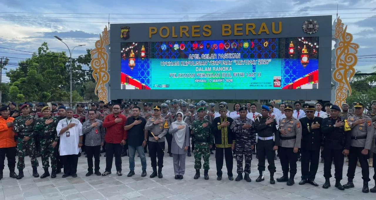 BERAU TERKINI – Bupati Berau, Sri Juniarsih, memimpin langsung Apel Gelar Pasukan Operasi Kepolisian Terpusat Ketupat 2026 di halaman Mapolres Berau, Kamis (12/3/2026).