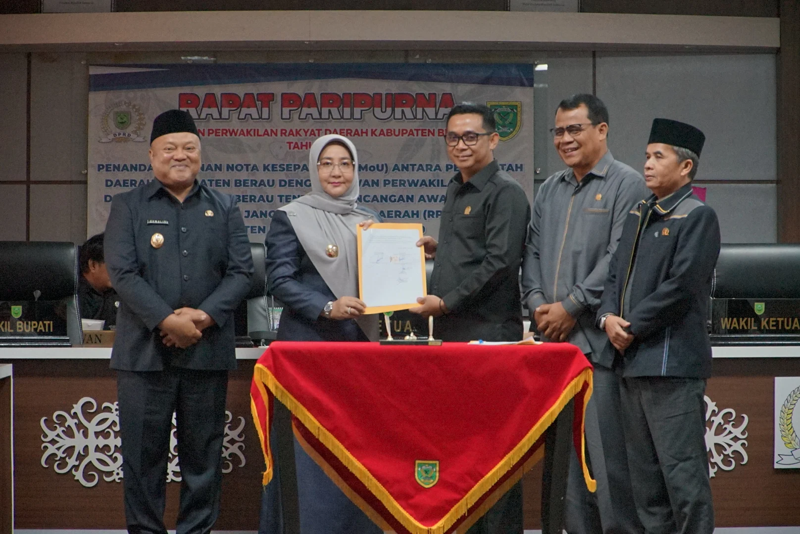 Penandatanganan dokumen tersebut dilakukan langsung Bupati Berau, Sri Juniarsih, bersama pimpinan DPRD Berau, yakni Ketua DPRD Dedy Okto Nooryanto, serta Wakil Ketua Subroto dan Sumadi, Senin (13/4/2026).