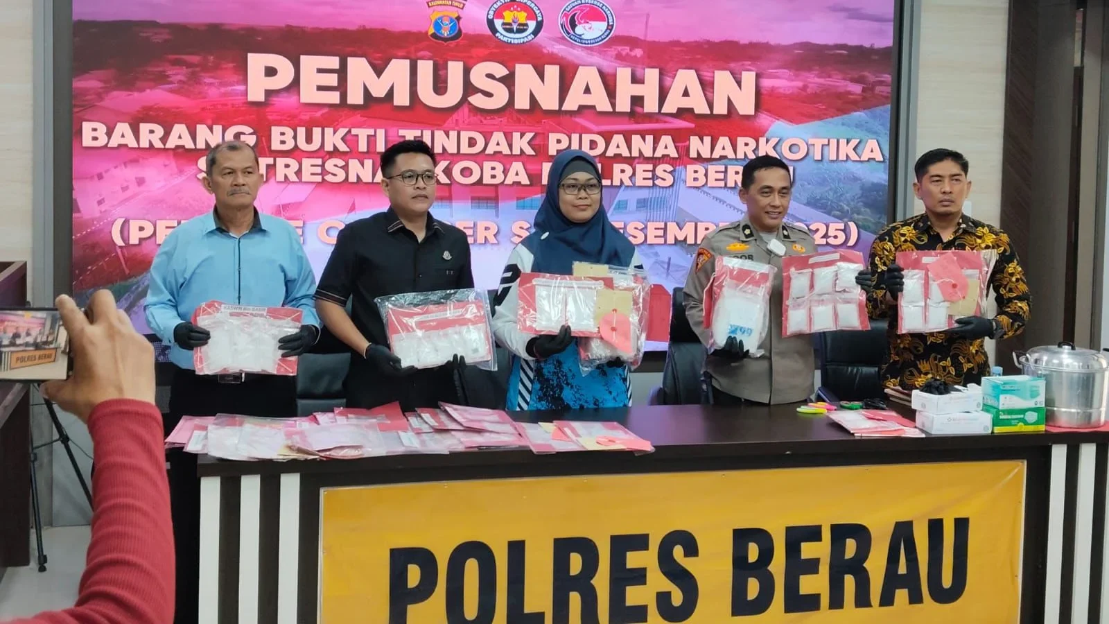 BERAU TERKINI – Sebanyak 3 kilogram lebih sabu hasil pengungkapan puluhan kasus narkoba dimusnahkan aparat Polres Berau, Jumat (23/1/2026).
