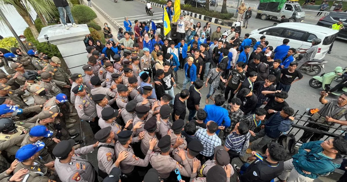 Meski sempat terjadi dorong-mendorong saat massa mencoba masuk ke area kantor gubernur, aparat kepolisian dan Satpol PP berhasil menjaga situasi tetap terkendali.