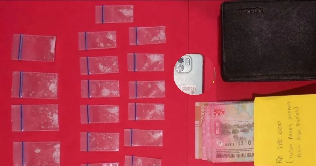 Penggeledahan di kamar SF membuahkan hasil mengejutkan, petugas menemukan 65 poket sabu siap edar seberat 25,7 gram yang disembunyikan dalam kaleng wafer, lengkap dengan timbangan digital dan alat hisap (bong).